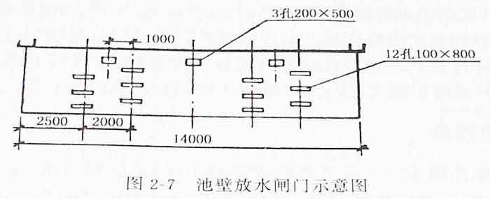 進灰水渠道斷面為50cm×70cm,總長200m。池壁放水閘門(圖2-7)由標(biāo)高0.3m開始,每隔0.2m設(shè)兩個0.1m×0.8m的排水孔,及標(biāo)高0.5m、0.7m、0.9m、1.1m和1.3m處各設(shè)兩個。標(biāo)高1.5m處設(shè)三個0.2m×0.5m的排水孔。排水管道190m,井點抽水設(shè)備兩套。